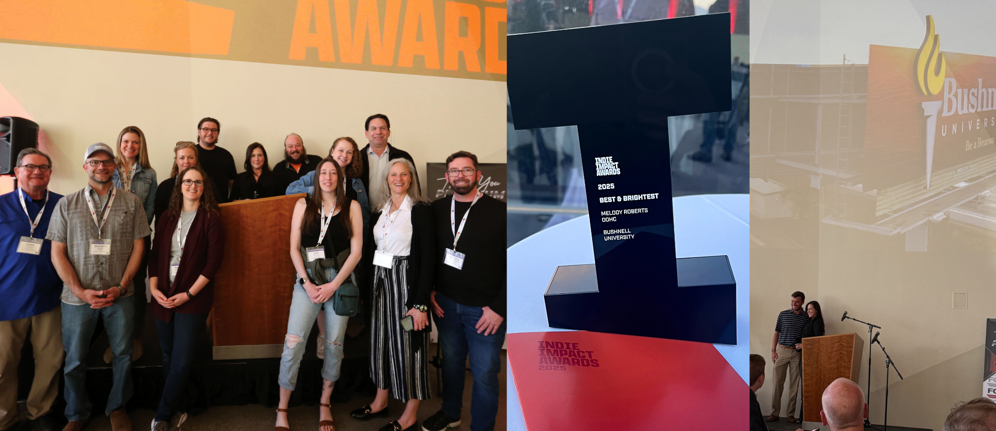 The highlight of the trip was seeing Melody win the Best and Brightest Indie Impact Award for her artwork for Bushnell University, which was well deserved! Melody did a splendid job on the project and Meadow was able to perfectly execute her vision. We make a great team, congratulations and thank you to Melody for taking home the prize!