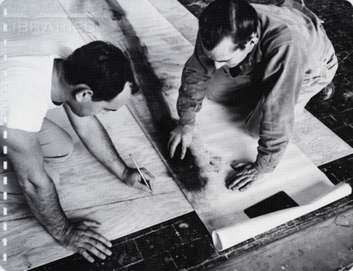These two men are pouncing the painting pattern onto the cutout assembly.