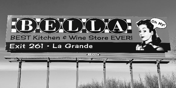 This design for Bella Mercantile, a local billboard advertiser in Eastern Oregon, is a case study for both readability and contrast. The main message is by far the most noticeable element on the billboard, but the tagline and directional are still legible and short. The pink, black, and white colors all have a high contrast, so they separate well even in black and white. Your design should appear similarly legible and contrasted.