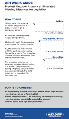 Lastly, another help for testing your design effectiveness is to download the test guide on our website. When printed out, this tool helps you frame your artwork at a distance, which simulates how the billboard will appear outdoors. The artwork guide also offers questions to help focus the creative in a way that is outdoor-minded.