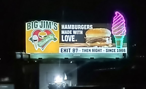 The first is Big Jim’s drive in in the Dalles, OR. They wanted to catch the eye of more customers and emphasize their ice cream cone extension. The green and pink lights are a little unorthodox, but they certainly stand out, which is the goal!