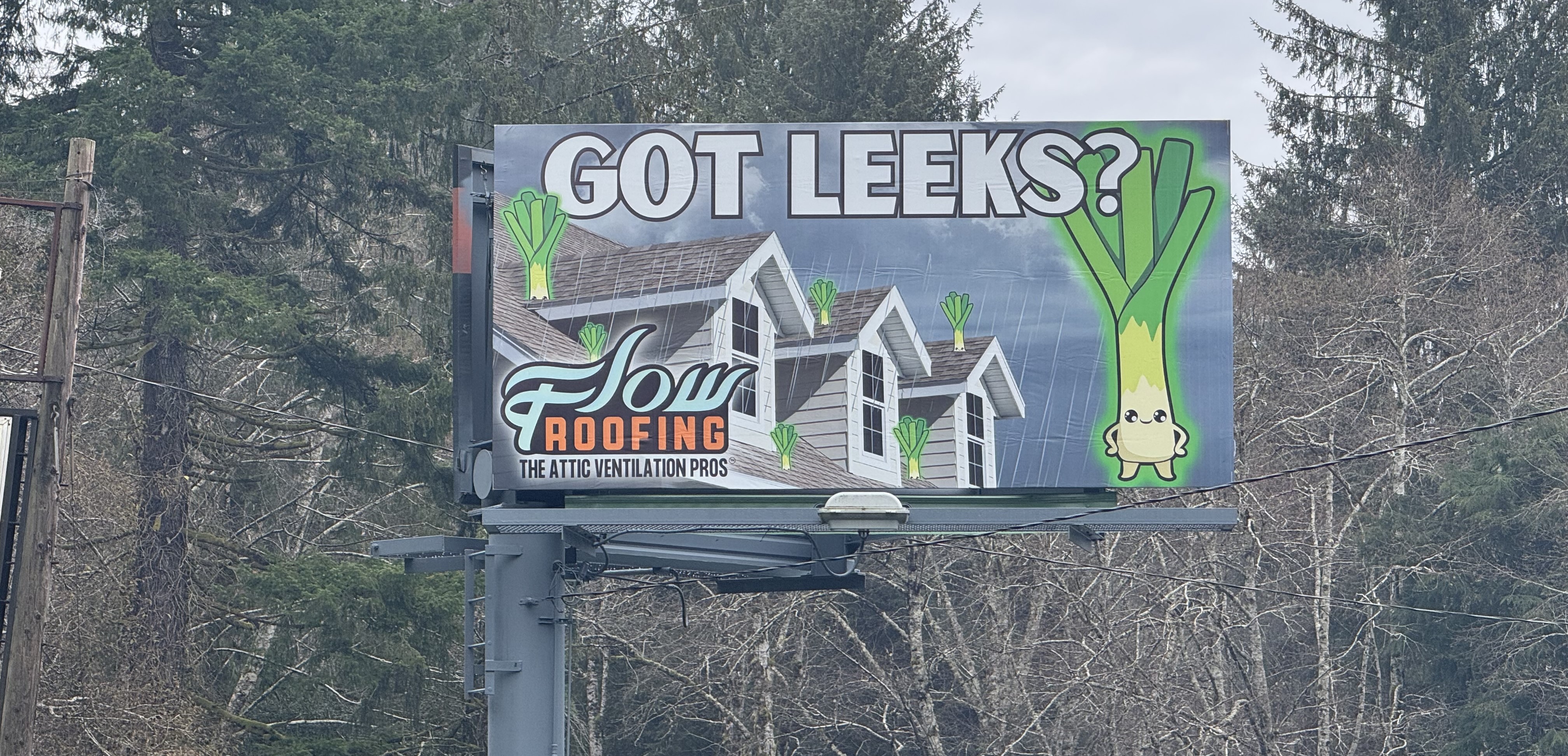 Quick, pithy humor is perfect on billboards! We understood this assignment for Flow Roofing and made this concept that they had featured before on their Instagram into a fun and memorable billboard!