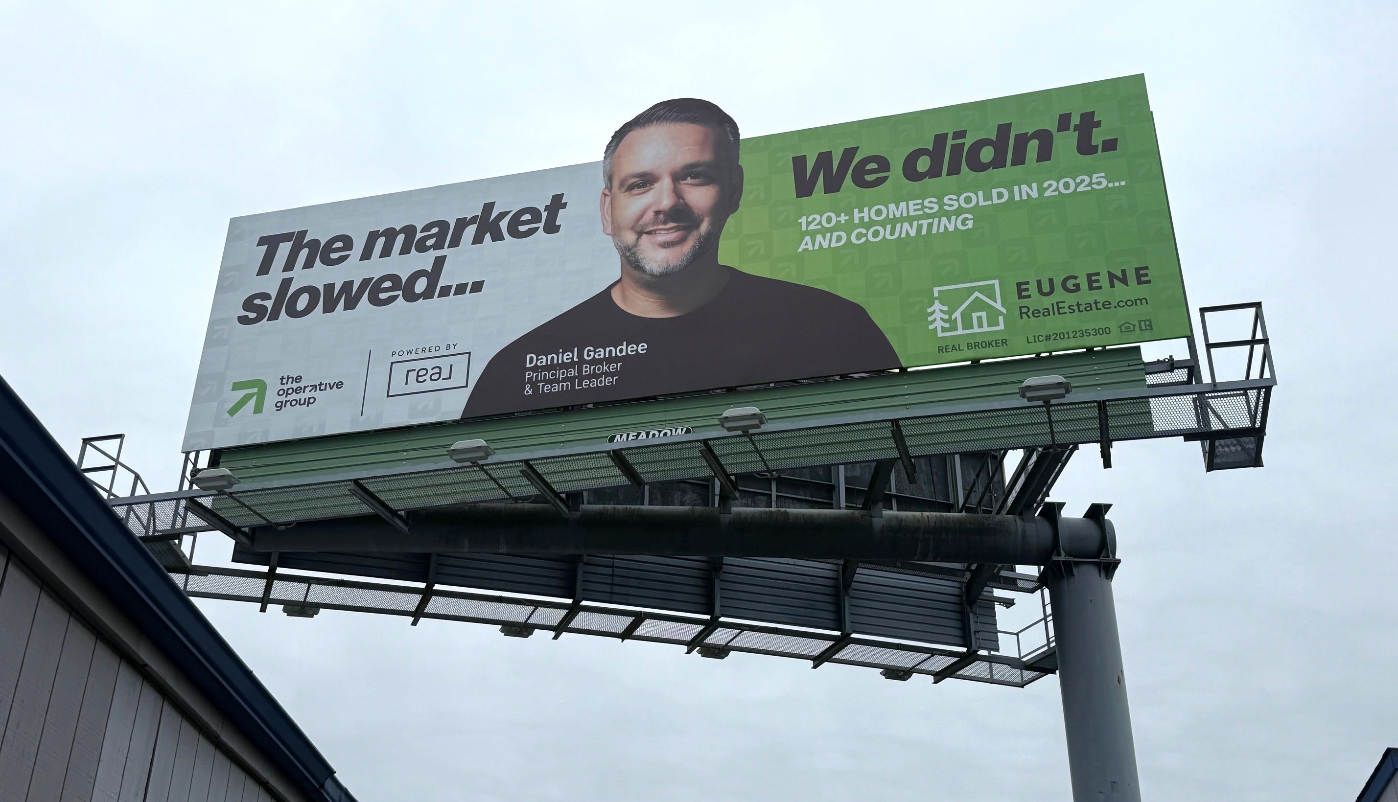 Creating a tagline that will resonate with the target audience can be tricky, but it will always pay off big time. This tagline captures how home buyers are feeling while reassuring them that this service will be capable of helping them. Combine that with an extension and a color scheme that pops against the gray Eugene sky, and this billboard is a winner!