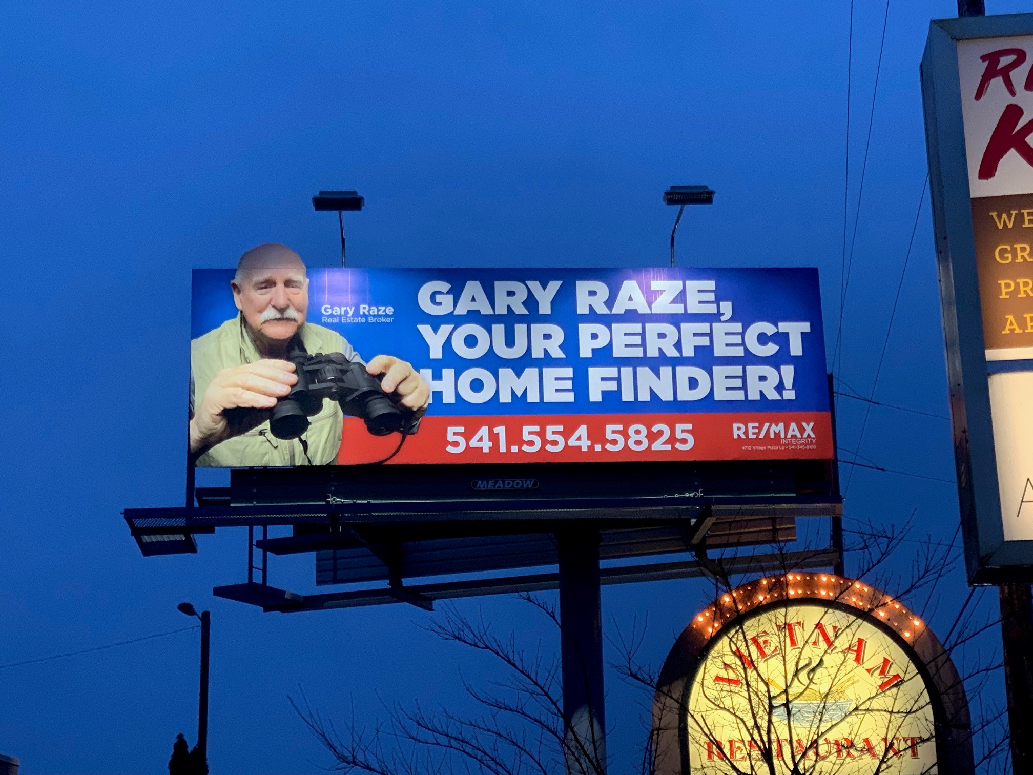 The owner, Gary Raze posed for these photos himself, and his bald head extension on top of the billboard is iconic! The bold font can’t be missed, and the phone number is a single and simple contact method.