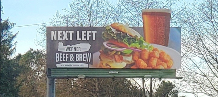 Large visuals on billboards are always the way to go and this burger and beer is the perfect mouthwatering imagery for Werner Jerky! The extension is a great addition, making the ad larger and more memorable.