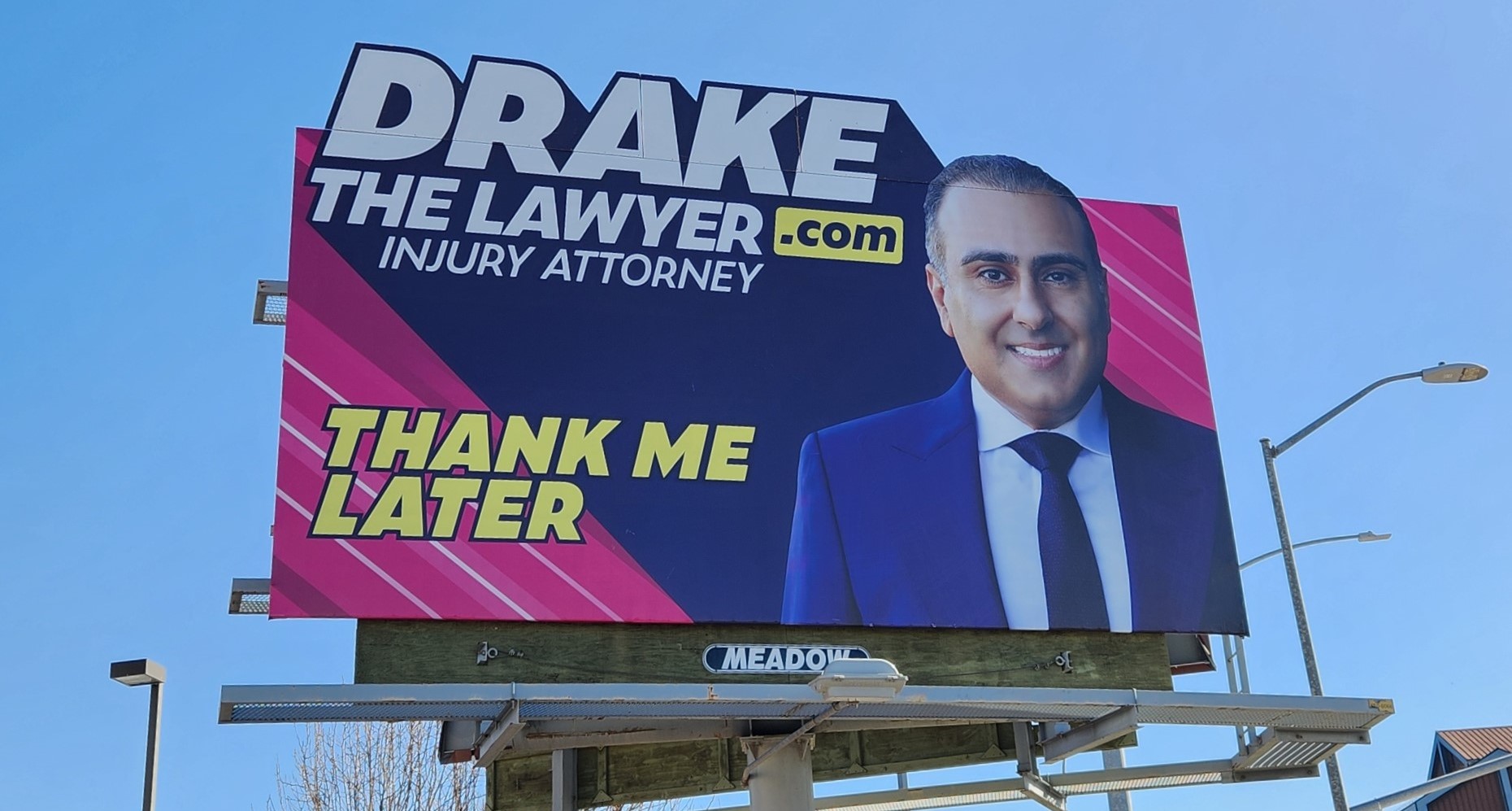 This vibrant display in California will turn heads! Attorney billboard artwork is notoriously boring and lacking in creativity. But this artwork breaks that mold with bright, contrasting colors and a beautifully executed lettering extension.