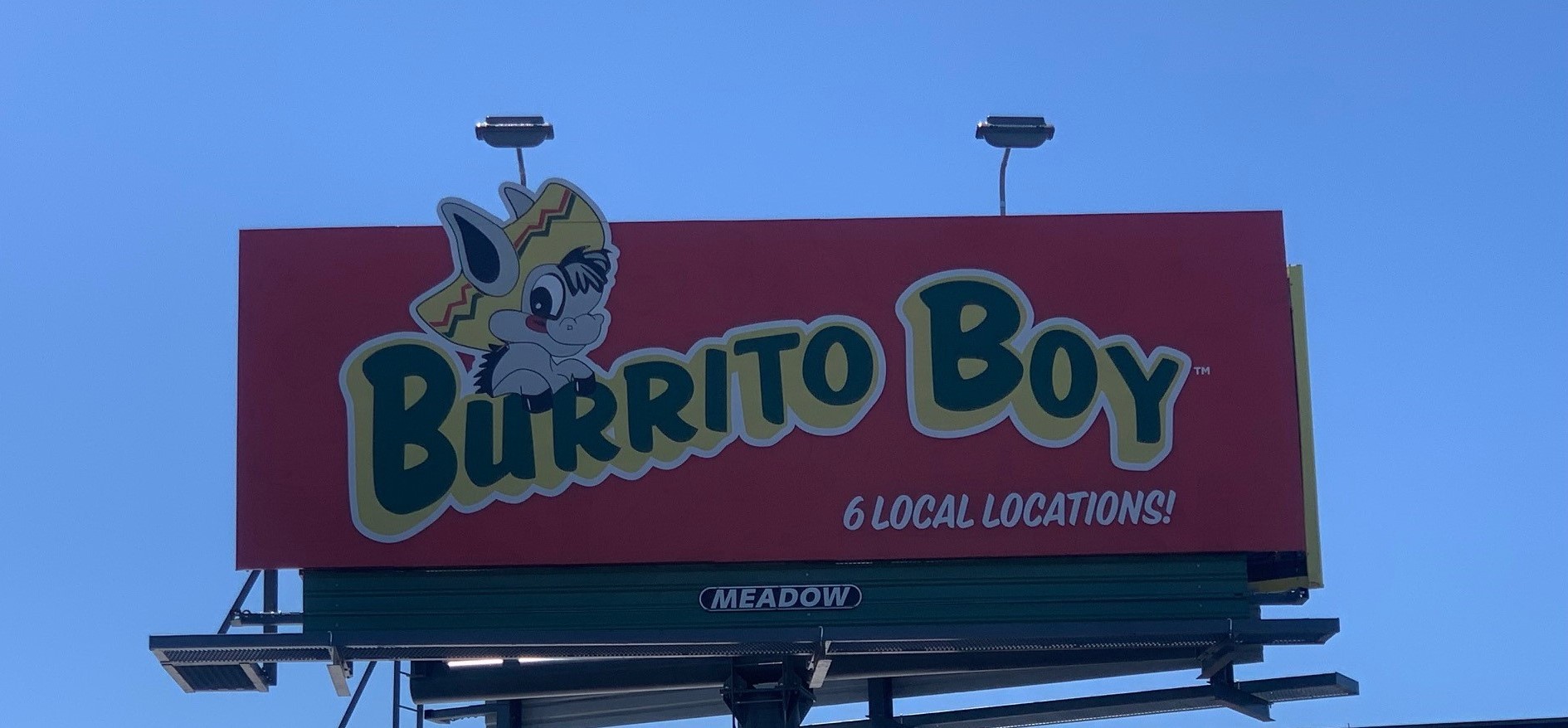 This billboard in Eugene, OR has high contrasting elements, a cute mascot on their extension, and minimal text! It doesn’t need a any contact method, the billboard is very close to one of the Burrito Boy restaurants and so there was no need to waste space with an address, phone number or website.