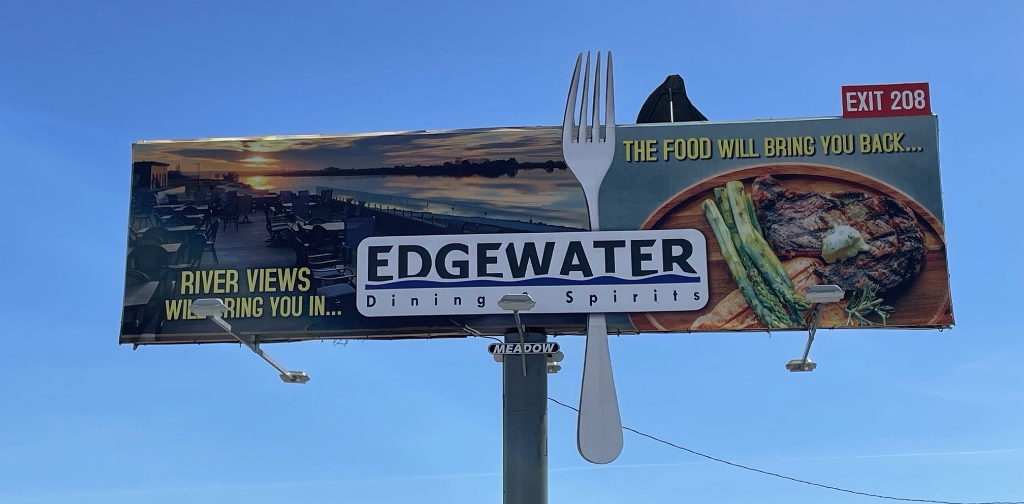 This display is one of a kind, this huge extension off the top and bottom of the billboard with thin fork tines that had to each be individually reinforced. Also, there is a third smaller extension on the top right that displays the exit number. Besides the extensions the food and the landscape photos are visually appealing, colorful, and the hierarchy of the text highlights the most important copy.