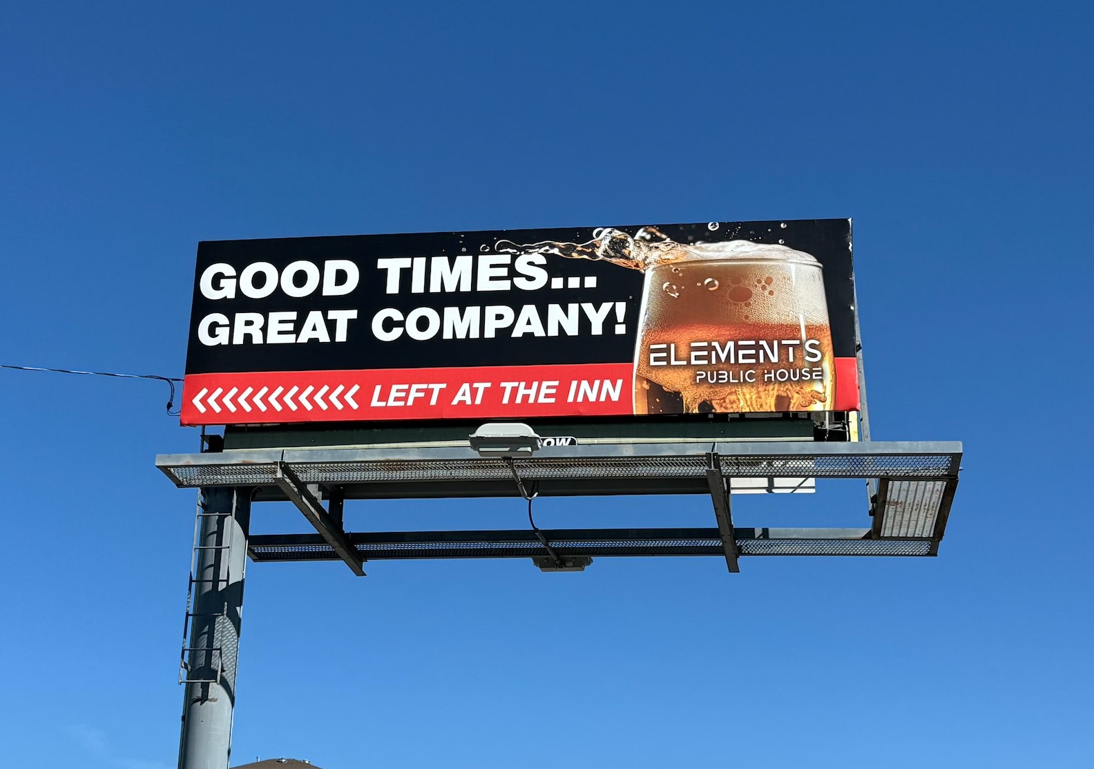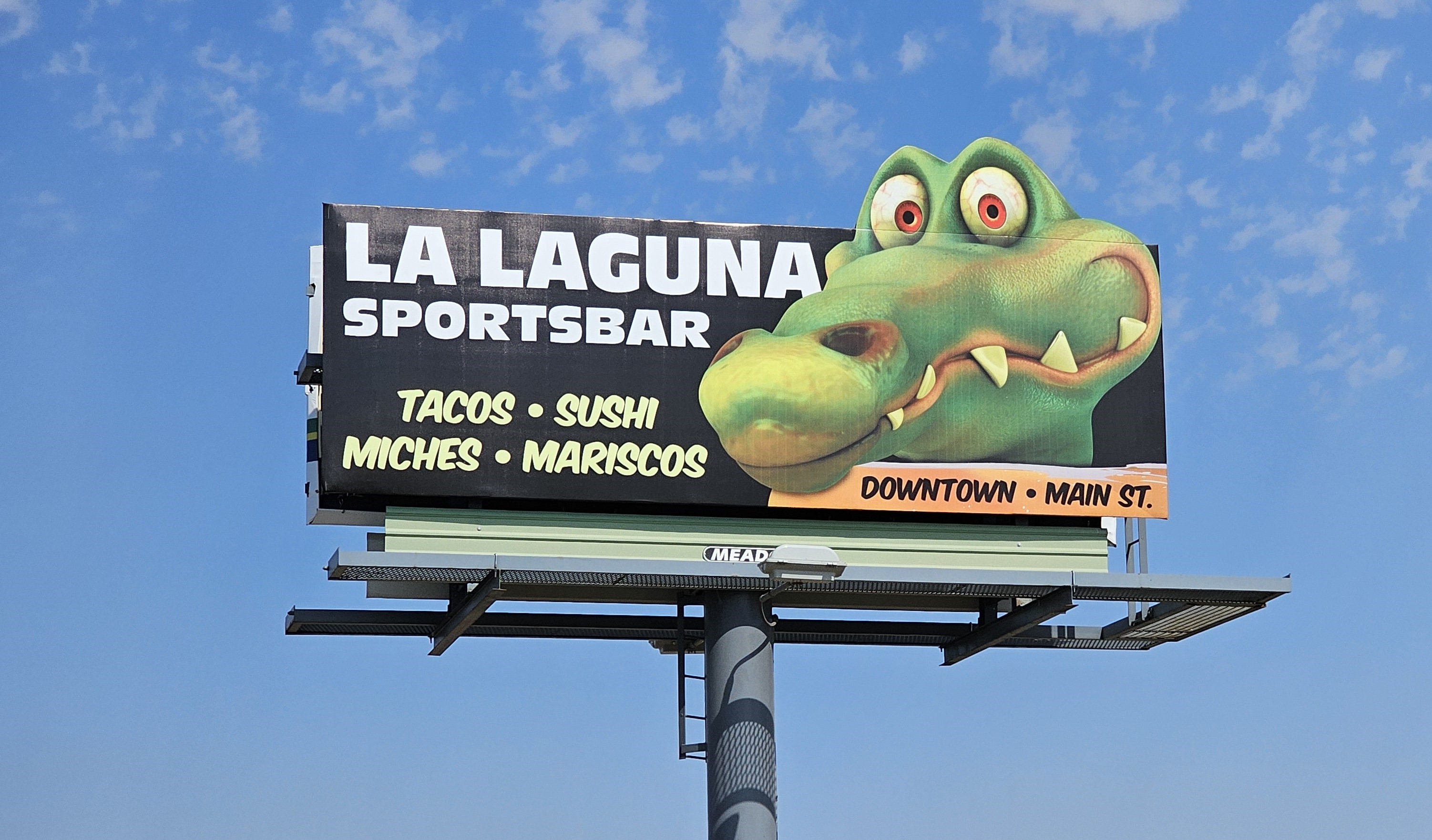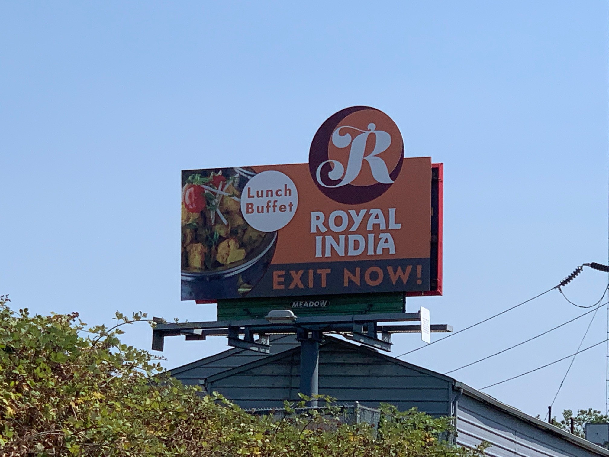 This small billboard stands out perfectly from the blue sky behind it with a bright orange background, a great photo of delicious food, and a small extension that packs some punch!